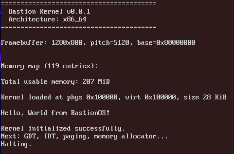 {arch}/bastion.img— Image for run in QEMU{arch}/boot/— directory with efi application{arch}/kernel/— directory with ELF kernel